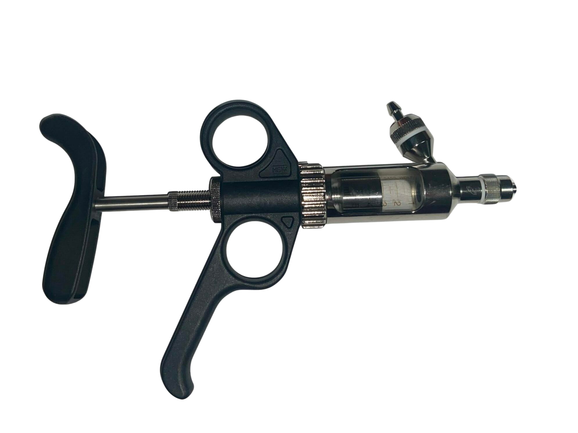 This is a HSW unimatic adjustable syringe. The syringe can fill volumes of .5 to 5ml in .025 ml increments.